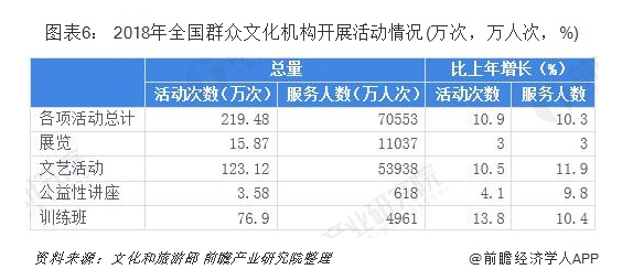 2018年全國群眾文化(huà)機構共組織開展各類文化活動219.48萬(wàn)場次,比上年(nián)增長10.9%;服務人(rén)次70553萬,比上年增長10.3%。